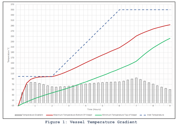 Figure 1 illustrates the top and bottom temperature of the vessel over the 9-hour period. The gradient, or the maximum difference in temperature between the bottom and top vessel surface, is also plotted for visual clarity. It should be noted that while the differential top and bottom temperature doesn’t directly correspond to the resulting stress, it does provide insight on how the vessel could be monitored during start-up and operations. The highest thermal gradient is predicted to be approximately 95°C, this could be monitored to ensure the vessel distributes the heat as predicted. The thermal profile of the maximum gradient is shown in Figure 2.